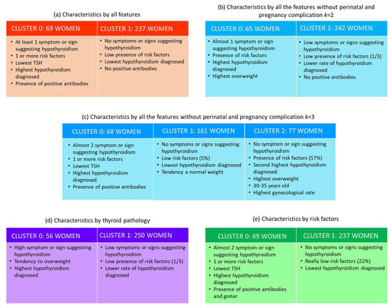 To our knowledge, this is the first application of cluster analysis to identify distinct risk factors and demographic features in a cohort of first-trimester pregnant women with a thyroid profile, a disorder believed to involve multiple disease subtypes [87,88,89,90,91]. Several previous studies analyzed the clinically relevant features and maternal outcomes of hypothyroid and euthyroid pregnancy, leading to new insights about the classification of women with similar patterns [92,93,94]. While the impact of these studies contributes to the literature, none of them focus on first trimester pregnancy or risk factor of thyroid pathology.