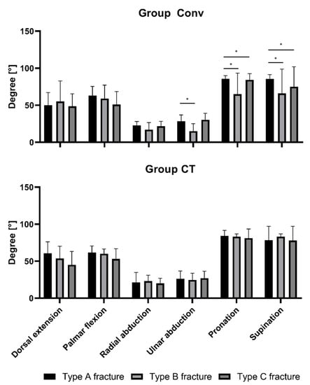 In Group Conv: Ulnar abduction Type A 30.4 ± 8.9° vs. Type B 51.0 ± 10.0°, p = 0.0026; Pronation Type A 85.7 ± 4.3° vs. Type B 65.0 ± 28.3°, p < 0.001 and vs. Type C 82.1 ± 8.2, p = 0.03; and Supination Type A 85.6 ± 5.7° vs. Type B 66.0 ± 32.9° p = 0.001 and vs. Type C 75.1 ± 26.8, p = 0.004. Type A, Type B, and Type C fractures had comparable ROMs in Group CT (Figure 1).