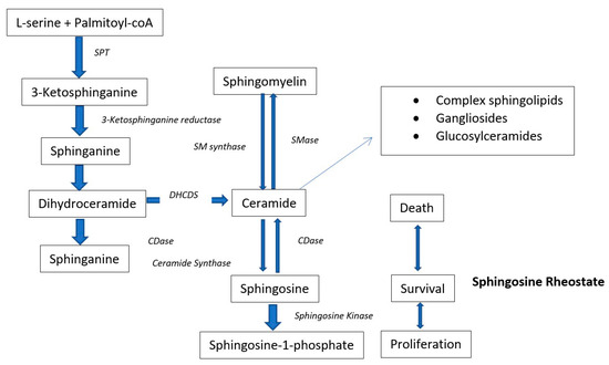 Schematic presentation of the de novo biosynthesis of ceramide and ceramide metabolism. SMase, sphingomyelinase; CDase, ceramidase; SM synthase, sphingomyelin synthase. (Modified from: Brozinick, Hawkins [87]).