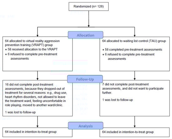 Participants completed assessments at baseline (T1; pre-treatment), post-treatment (T2), and 3-month follow-up (T3). During the study period, staff was asked to complete an observation scale for each participant once weekly, to monitor aggressive behavior at the ward. Observation started three months before the intervention and lasted until end of follow-up. Participants who dropped out of the treatment were still included in the staff observation ratings. Treatment as usual consisted of standard treatments, including for instance: medication, psychomotor therapy, schema focused therapy, supportive counseling, skills training, or treatment for substance use disorders. Patients were allowed to participate as long as it did not directly target their aggression problems. Participants in the waiting list were offered VRAPT after they had completed follow-up measurements. The participants from the treatment group, completed a short interview with a research assistant at T3. See Figure 1 for the CONSORT flow diagram of VRAPT.