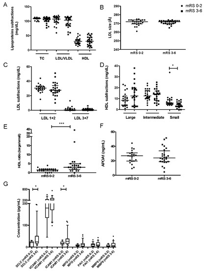Lipoprotein subfractions, plasma levels of APOA1 and inflammatory cytokines between stroke patients with favorable (mRS 0–2, n = 22) or unfavorable (mRS 3–6, n = 24) outcomes. (A) Concentration of lipoprotein subfractions. (B) Mean LDL particle size. (C) Concentration of LDL subfractions. (D) Concentration of HDL subfractions. (E) Ratio of large/small HDLs. (F) Concentration of APOA1. Values are medians ± IQR. (G) Concentration of each inflammatory marker quantified. Boxes delineate the 10th and 90th percentiles, and points demonstrate outliers. * p < 0.05, *** p < 0.001. Abbreviations: TC, total cholesterol; LDL/VLDL, low-density lipoprotein/very low-density lipoprotein; HDL, high-density lipoprotein; APOA1, apolipoprotein A1; IQR, interquartile range.