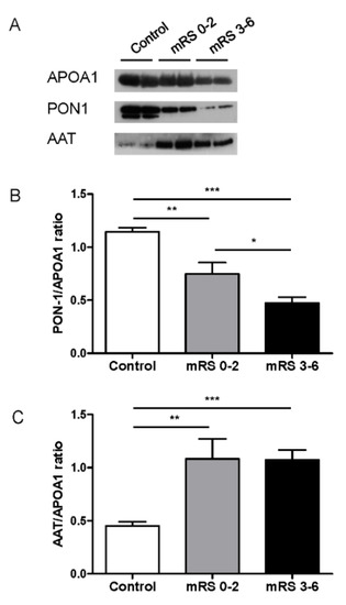 HDL-associated proteins. (A) Western blot analysis of AAT, PON-1 and APOA1 in isolated HDLs. (B) Quantification of HDL-associated PON1 and (C) AAT after normalization to APOA1 intensity in healthy donors (n = 12) and stroke patients with favorable (mRS 0–2, n = 22) or unfavorable (mRS 3–6, n = 24) outcomes. Values are means ± SEM. * p < 0.05, ** p < 0.01, *** p < 0.001. Abbreviations: APOA1, apolipoprotein A1; PON-1, paraoxonase-1; AAT, alpha-1 anti-trypsin.