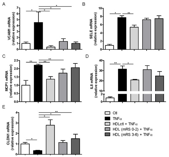 Effects of HDLs on brain–blood barrier (BBB) endothelial cells stimulated by TNFα. mRNA expression of (A) VCAM1, (B) SELE, (C), MCP1, (D) IL8 and (E) CLDN1 in hCMEC/D3 cells co-incubated with TNFα and HDLs from healthy donors (HDLctl, n = 6) or stroke patients with favorable (mRS 0–2, n = 22) or unfavorable (mRS 3–6, n = 21) outcomes. Values are means ± SEM. * p < 0.05. Abbreviations: VCAM1, vascular cell adhesion molecule 1; SELE, E-selectin; MCP1, monocyte chemoattractant protein-1; IL8, interleukin 8; CLDN1, claudin-1.