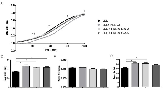 LDL (100 µg/mL) oxidation was induced by the addition of CuSO4 to yield a concentration of 5 µmol/L. HDLs (8 µg/mL) from healthy donors and patients were incubated with LDL to test their capacity to delay oxidation. LDL lipid oxidation to conjugated dienes was monitored every minute for 2 h by measuring the change in absorbance at 234 nm. Using experimental curves of oxidation kinetics, the duration of the lag time, the maximal propagation rate (Vmax) of lipid peroxidation and the maximum conjugated diene formation (Tmax) were calculated. The lag time was defined from the absorbance curve as the time given by the intercept of the two straight lines from the lag and propagation phases on the time axis. Vmax was determined as the peak of the first derivative of the absorbance curve (change in absorbance as a function of time, dA/dt), and Tmax was obtained by the projection of Vmax onto the time axis of the first derivative of the absorbance curve [25].