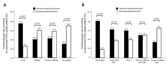Cardiovascular risk according to myocardial uptake pattern of 18F-FDG-PET/CT. Patients were stratified by normal/abnormal myocardial perfusion imaging (MPI) findings. The Y-axis depicts the percentage of patients with abnormal and normal myocardial perfusion/function, respectively, in each subpopulation of distinct myocardial uptake pattern. The total number of patients within a subpopulation is set as 100%. (A) While focal myocardial 18F-FDG uptake was predominantly observed in patients with abnormal perfusion and function, patients with no myocardial 18F-FDG uptake more frequently presented with normal cardiac perfusion/function. (B) Dividing focal and focal on diffuse patterns into subgroups revealed that the focal spot pattern further improved risk prediction for cardiac abnormalities.