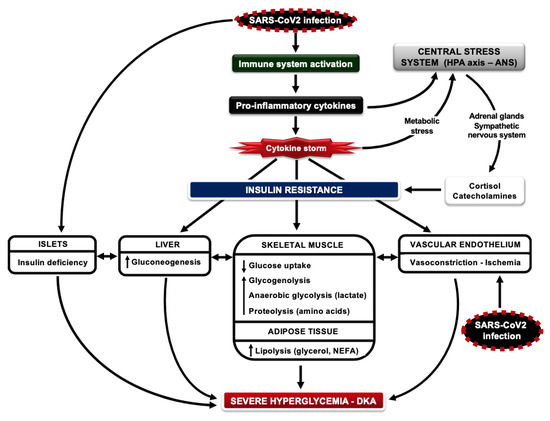- T2DM is an inflammatory disease characterized by the increased production of proinflammatory cytokines from adipose tissue/endothelial cells and insulin resistance in the liver/muscle/adipose tissue, along with inadequate β-cell function; by the time of clinical diagnosis, at least 50% of β-cell mass has been lost due to progressive destruction by oxidative stress, generated from the elevated levels of glucose and NEFAs in the circulation (glucotoxicity and lipotoxicity) [81]. In type 1 DM (T1DM), although it results from the primary loss of β-cell mass due to autoimmune processes with consecutive insulin deficiency, residual β-cell function may be retained in some individuals for years after clinical diagnosis; it should be noted that insulin resistance and an inflammatory state are also features of this type of DM [82,83,84]. In the presence of insulin resistance, poor glycemic control reflects relative insulin insufficiency for the corresponding metabolic needs; insulin resistance and the shortage of insulin may promote a catabolic state. In the course of COVID-19 infection, insulin requirements increase dramatically due to the “cytokine storm” and high insulin resistance [27]. Considering the fact that SARS-CoV2 may also directly attack the islets, severe insulin deficiency aggravates the catabolic state, generating massive increases in circulating glucose and NEFAs; these will lead to severe ketoacidosis or a hyperglycemic hyperosmolar state and multi-organ failure [27,85] (Figure 1).