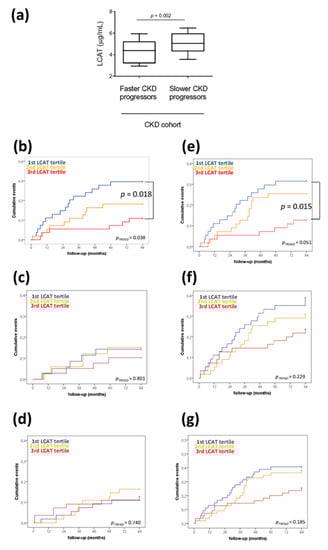 It is worth noting that reduced LCAT concentration specifically predicted faster CKD progression and worse disease-related prognosis, as a 1 μg/mL reduction in LCAT concentration was predictive of an increased risk of a composite outcome of all-cause mortality and faster CKD progression (HR = 1.742 (1.060–2.864), p = 0.029), while it was not predictive for all-cause mortality alone (HR = 1.058 (0.487–2.297), p = 0.887) or for the occurrence of cardiovascular fatal or non-fatal events alone (HR = 0.622 (0.366–1.057), p = 0.079) (Table S2).