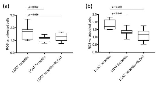 To prove that low LCAT concentration was responsible for the increased damaging effect of serum in renal cells, serum from subjects in the 1st LCAT tertile was incubated with rhLCAT [24] to restore a concentration comparable to that of subjects in the 3rd tertile, thus allowing a proper HDL remodeling. Then, podocytes and tubular cells were incubated under these conditions (Figure 2). Interestingly, the addition of rhLCAT to sera from subjects in the 1st tertile reduced serum-mediated ROS production to a level similar to that observed with sera from 3rd LCAT tertile subjects in podocytes (Figure 2a) and, even more strikingly, in tubular cells (Figure 2b). The addition of serum-free rhLCAT to podocytes had a neutral effect on ROS production, thus suggesting that LCAT-induced modifications in lipoproteins, and specifically in HDL, may be responsible for the observed effect. Indeed, incubation of plasma with rhLCAT resulted, as expected, in a significant decrease in unesterified cholesterol and in a significant 50% reduction in the preβ-HDL particle content (Table S5).