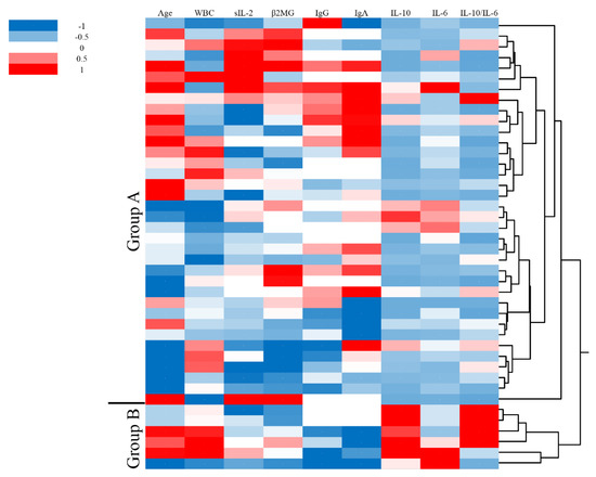Clustering analysis is shown in Figure 1. Using unbiased clustering analysis, patients were divided into two groups. Group A consisted of patients who had low vitreous IL-10, high serum IgA and low WBC count. Group B consisted of patients who had high vitreous IL-10, low serum IgA and high WBC count.