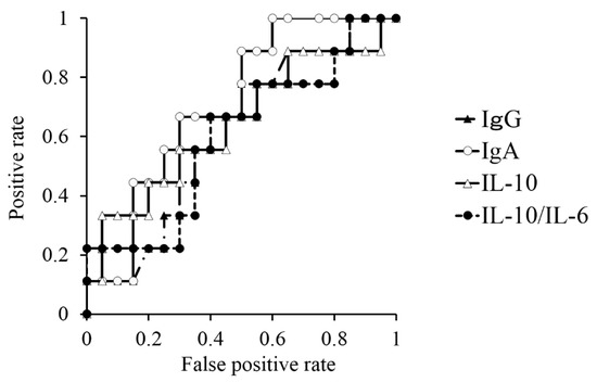 We plotted ROC curves to investigate which laboratory finding among IgG, IgA, IL-10 and IL-10/IL-6 ratio is most suitable for predicting prognosis. ROC curves for IgG, IgA, IL-10 and IL-10/IL-6 ratio are shown in Figure 2 and Table 6. The areas under the ROC curves for IgG, IgA, IL-10 and IL-10/IL-6 ratio were 0.61, 0.71, 0.64 and 0.60, respectively. This result indicates that serum IgA is most suitable for the prediction of prognosis.