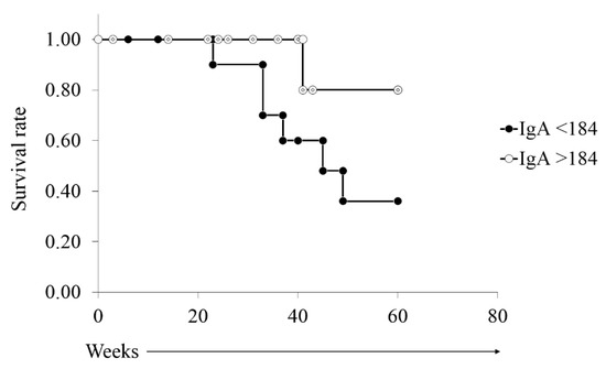 Next, we analyzed survival by the Kaplan–Meier method in patients stratified by the cutoff serum IgA concentration obtained from the ROC analysis. Patients with IgA below 184 mg/dL tended to have poorer prognosis of survival in a five-year period, although the difference was not statistically significant (p = 0.06) (Figure 3). When we compared the clinical features of patients divided by the serum IgA concentration of 184 mg/dL (Table 7), patients with IgA below 184 mg/dL had more recurrences than patients with IgA above 184 mg/dL (3.2 versus 1.7, p = 0.02). Moreover, the three-year survival rate was significantly worse in patients with IgA below 184 mg/dL compared with those with IgA above 184 mg/dL (p = 0.03). These results indicate that patients with serum IgA lower 184 mg/dL have poor prognosis due to frequent recurrences.