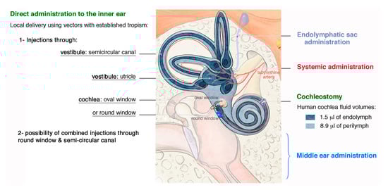 - Li Duan, M.; Bordet, T.; Mezzina, M.; Kahn, A.; Ulfendahl, M. Adenoviral and adeno-associated viral vector mediated gene transfer in the guinea pig cochlea. Neuroreport 2002, 13, 1295–1299. [Google Scholar] [CrossRef] [PubMed]