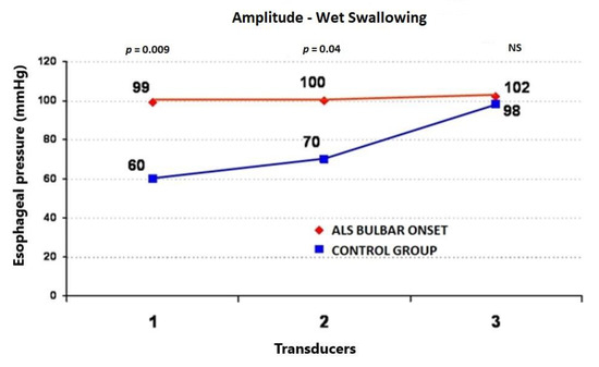 Comparison of the mean values of peristaltic wave amplitude during wet swallows between ALS patients with dysphagia and the control group (from three transducers).
