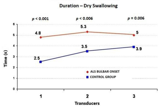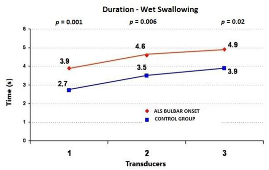 Comparison of mean values of peristaltic wave duration during wet swallows between ALS patients with dysphagia and the control group (from three transducers).