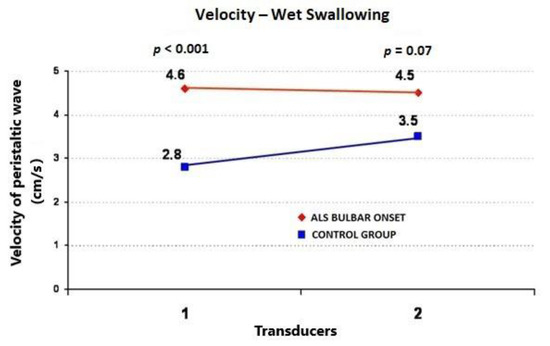 Comparison of mean values of velocity of peristaltic wave propagation during wet swallows between ALS patients with dysphagia and the control group (from two transducers).