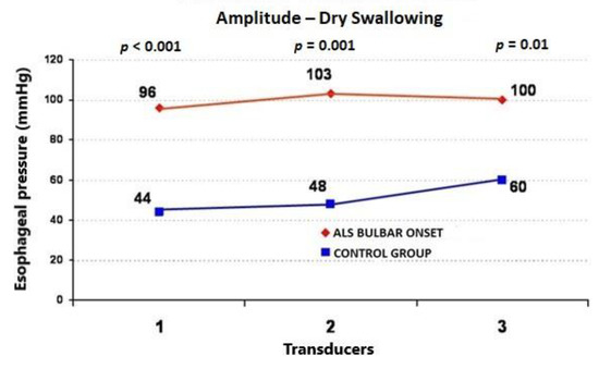 Comparison of mean values of peristaltic wave amplitude during dry swallows between ALS patients with dysphagia and the control group (from three transducers).