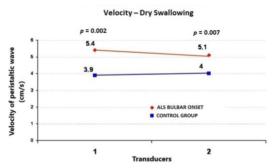 Comparison of mean values of velocity peristaltic wave propagation during dry swallows between ALS patients with dysphagia and the control group (from two transducers).
