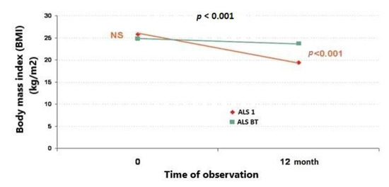 The ALSBT patients showed a smaller decrease in BMI (from 24.8 ± 3.2 (95%CI = 22.8−26.8) to 23.7 ± 3.8 (95%CI = 21.3–26.1)) (p = 0.5) compared to ALS1 patients (from 25.8 ± 1.7 (95%CI = 24.7–26.9) to 19.4 ± 2.0 (95%CI = 18.2−20.6)) (p < 0.001) during the 12-month period (Figure 7).