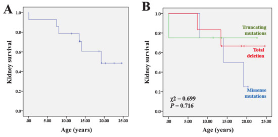 At the last follow-up, 12 patients (86%) showed progressive renal functional deterioration (eGFR < 90 mL/min/1.73 m2), including six patients (43%) who progressed to ESRD at the median age of 10.7 years (IQR 5.6–15.3; Table 1). One of the patients (Patient 6) manifested ESRD during the neonatal period. The annual reduction in eGFR, which was calculated in 13 patients using serial eGFR values measured after 2 years of age, was −2.1 mL/min/1.73 m2 (IQR −4.2–−1.0 mL/min/1.73 m2), and the reduction rates showed no significant difference between patients who progressed with ESRD (−2.1 [IQR −4.2–−1.4] mL/min/1.73 m2) and those who did not (−2.3 [IQR −4.2–−1.2] mL/min/1.73 m2). The kidney survival rates at the 10-year and 20-year follow-up were 79% and 49%, respectively (Figure 1A).