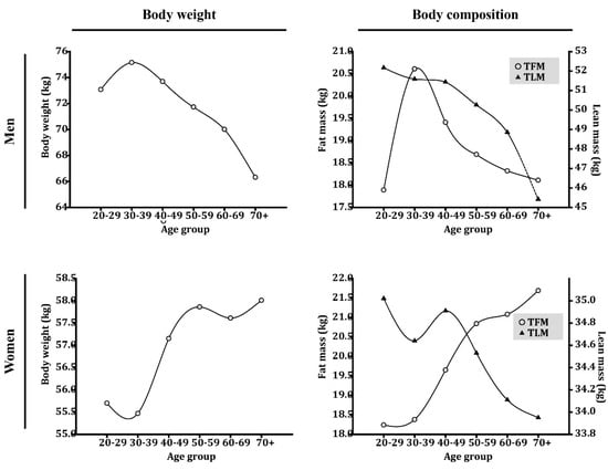 - Jackson, A.S.; Janssen, I.; Sui, X.; Church, T.S.; Blair, S.N. Longitudinal changes in body composition associated with healthy ageing: Men, aged 20–96 years. Br. J. Nutr. 2012, 107, 1085–1091. [Google Scholar] [CrossRef]