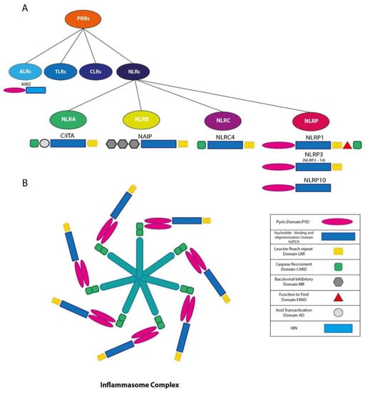 (A) Schematic representation of Pattern Recognition receptors (PRR) and nucleotide-binding oligomerization domain (NOD)-like receptors (NLRs); (B) schematic representation of inflammasome complex.