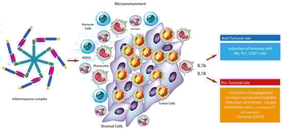 Several studies showed that aberrant inflammasome activation is often associated with the development and progression of cancer. In particular, tumor associated inflammation is triggered by a variety of immune cells, including neutrophils, T and B lymphocytes, macrophages, NK cells and DC cells. Other studies indicate that inflammasome may have ambivalent effect in tumors: it can contribute to the pathogenesis, development and neoplastic progression and maintenance of the tumor microenvironment or on the contrary suppress tumor growth through the phenomenon of pyroptosis and death of pre-malignant cells. Such different effect can in part be explained by the heterogenicity of cancer cells and the fact that different inflammasomes have different roles. [34,35,36,37]. Consistently, mutations in genes encoding inflammasome components often lead to susceptibility to cancer, infection and autoinflammatory diseases in humans [35,38,39,40,41,42,43,44,45]. Taken together, these results suggest that the pro-tumorigenic or antitumorigenic properties of inflammasomes and related cytokines are largely determined by the types of cells, tissues and organs involved (Figure 2).