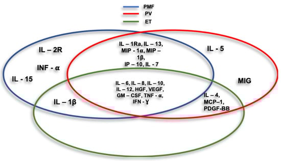 In recent years it has emerged that the tumor microenvironment (TME) and in particular the inflammatory microenvironment [63], plays a fundamental role in the pathogenesis of MPN. This progressively transformed tumor microenvironment (TME) is infiltrated by different types of immune cells that are likely to kill cancer cells in the initial stages, but over time the inability of immune cells to inhibit the abnormal growth of cancer cells prevails depending on a variety of events occurring at the tumor site [36]. Hence, MPNs, that are initiated by the appearance of a myelostimulatory mutation, propagate through an evolving cascade of inflammatory conduits that entail dramatic symptoms and impairment of the quality of life of affected patients [47]. Taken all together these evidences suggest that MPN is as a chronic tumor model driven by inflammation [64], in which chronic inflammation plays a critical role in the development and maintenance of MPN itself [49]. Consistently, numerous studies have been carried out over the years confirmed this theory and it is now clear that there is a close relationship between chronic inflammation and the pathogenesis of MPN. An evaluation of abnormal cytokine expression determined that primary myelofibrosis (PMF) patients had significantly increased levels of IL-1 β, IL-1RA, IL-2R, IL-6, IL-8, IL-10, IL-12, IL-13, IL-15, TNF-alpha, G-CSF, IFN-α, MIP-1α, HGF, IFN-γ and VEGF in addition to reduced IFN-γ levels while MIP-1β gave conflicting results. In PV, patients increased levels of IL-1RA, IL-4, IL-5, IL-6, IL-7, IL-8, IL-10, IL-12, IL- 13, IFN-γ, GM-CSF, MCP-1, MIP-1α, MIP-1β, HGF, IP-10, MIG, MCP-1, PDGF, TNF-α, IFN-γ and VEGF were measured [65,66,67]. An analysis of ET patients reported the presence of elevated levels of IL-1 β, IL-4, IL-6, IL-8, IL-10, IL-12, HGF, GM-CSF, IFN-γ, MCP-1, PDGF, TNF-α and VEGF. Taken together this evidenceline, levels of reported cytokines were higher compared to healthy controls, however some of these differences were not significant [65]. Interestingly, IL-4, IL-8, GM- CSF, IFN-γ, MCP-1, PDGF and VEGF appeared to be significantly higher in ET patients when compared to PV populations and may be used as markers to distinguish the two disorders [67] (Figure 3).