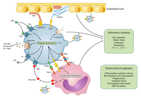 Main platelet–leukocyte interactions and inflammatory mediators released upon platelet activation. EC—endothelial cells; EV—extracellular vesicles; IL1—Interleukin 1; NAP-2—Neutrophil Activating Peptide-2; NET—neutrophil extracellular trap; PAF—platelet activating factor; PAR—protease activated receptor; PF4—platelet factor 4; PDGF—Platelet Derived Growth factor; TF—Tissue factor; TGFβ—Transforming Growth Factor β. VWF—von Willebrand factor. Mediators are stored in platelets. In italics—synthetized mediators/proteolytic cleavage of stored precursors upon platelet activation.