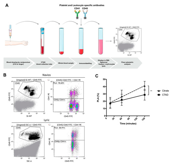 Platelet–leukocyte aggregates (PLAs) analyzed with flow cytometry (A). Schematic representation of sample preparation for PLA measurement in whole blood. Venous blood was drawn by puncture of a large vein using a 21-gauge needle and collected into tubes containing CTAD (sodium buffered citrate, theophylline, adenosine, and dipyridamole). The first milliliters were discarded. Blood sample was labeled using antibodies against CD45 and CD41 (20 µL of blood + 20 µL of PBS buffer + 10 µL of each antibody), with fixed incubation time (<1 h), followed by dilution (≥1/40) in PBS or with lysis and fixation buffer. (B) Example of samples acquired on Navios (top) or Lyric (bottom) flow cytometer. Blood was labeled using antibodies against CD45-FITC and CD41-PE, with 15 min of incubation (no lysis, no wash protocol). Final blood dilution was 1:44. Flow rate was at 70 events/sec and 10,000 events were acquired. Leukocytes (CD45) were defined as CD45pos side scatter high [CD45] (left panels). Then PLAs in [CD45] gated dot plots, were identified with the co-expression of CD45 and CD41 (right panels). (C) Effect of time prior to immunolabeling on PLAs. Blood was drawn into tubes containing 3.2% buffered sodium citrate or CTAD. Immunolabeling and processing of whole blood samples were performed 15, 60, and 150 min, following blood collection. Blood was labeled using CD45-FITC and CD41-PE antibodies (cf above), without lysis or fixation. Events were acquired on the Lyric system (Becton Dickinson). For every 10 min of time-interval prior to immunolabeling, PLA levels increased by 1.7% (95% CI 1.1 to 2.3, p < 0.0001) in citrate-anticoagulated blood (closed triangles, dashed line) and 0.8% (95% CI 0.2 to 1.4, p = 0.005) in CTAD-anticoagulated blood (closed squares, plain line). Linear regression analysis demonstrated a reduced rate of in vitro PLA formation, prior to immunolabeling with CTAD (solid line), compared to sodium citrate (dashed line) (p = 0.037). Data are reported as mean ± SEM (n = 7). SS INT and SSC-A—side scatter.
