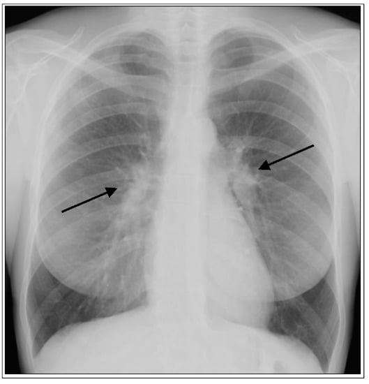Acute form of sarcoidosis. Posterior-anterior chest radiograph of a 35-year-old female with Löfgren’s syndrome demonstrating bilateral hilar adenopathy (arrows) without evidence of parenchymal lung involvement.