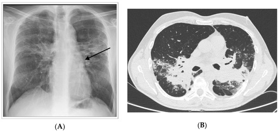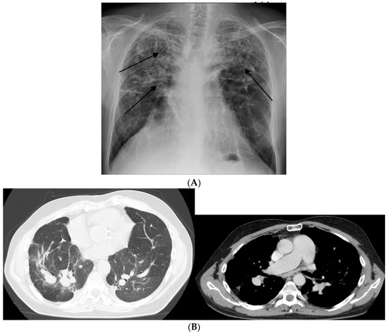 Chronic form of sarcoidosis. (A) Posterior-anterior chest radiograph of a 55-year-old man with progressive pulmonary fibrosis despite treatment demonstrating permanent, coarse linear opacities, radiating laterally from the hilum upward and outward (arrows). (B) high-resolution CT showing intra parenchymal enlargement of pulmonary arteries and enlarged pulmonary trunk at the bifurcation.