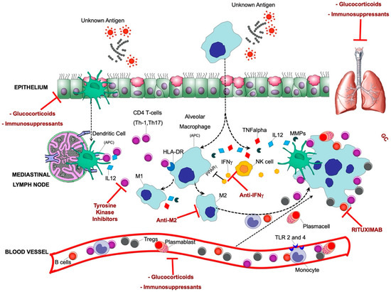Failure of immune regulatory mechanisms to limit the duration of Th1–Th17 inflammation has been suggested to contribute to persisting granulomatous responses in sarcoidosis. T regulatory cells (Tregs) are vital for the suppression of cell-mediated immune responses. However, Tregs in the sarcoid granulomas (as opposed to peripheral Tregs) that have also been found elevated in BALF from patients with sarcoidosis undergo extensive amplification and are therefore impaired in their ability to repress immune responses [64]. On the other hand, they secrete pro-inflammatory cytokines (e.g., IL-4), which induces granuloma formation via mast cell activation and fibroblast amplification [65]. To date, the role of regulatory T cells (Tregs) in the pathogenesis of sarcoidosis remains controversial. Further studies are needed to shed light on the complex interactions between regulatory mechanisms and off-targeted immune responses in the disease.
