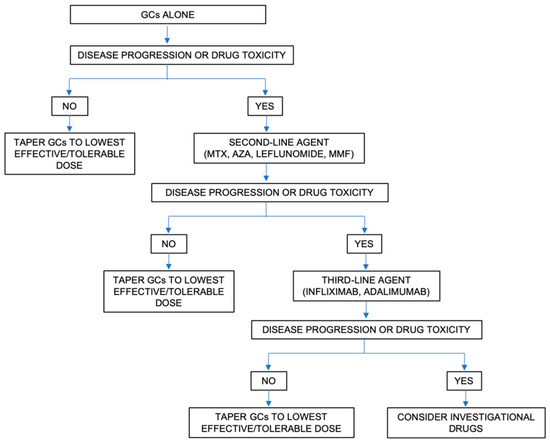 The majority of patients are able to discontinue treatment after one year; however, relapse is common during tapering or after GC discontinuation, with as many as 30% of patients requiring longer-term therapy [81]. Overall, the GC use is associated with symptomatic and radiographic improvement, at least initially, but their long-term benefit is unclear [82]. The antimalarial drug hydroxychloroquine may be preferable to GC in patients with skin disease or hypercalcemia [83,84].