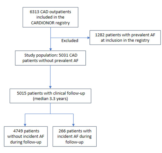Figure 1 shows the study flow chart. Among the 10517 outpatients included in the CARDIONOR registry, a total of 6313 had documented CAD. We excluded 1282 patients with prevalent AF, leaving 5031 CAD patients with no history of AF at registry inclusion. For the present analysis, we focused on the 5015 patients (99%) for whom follow-up was available. Two investigators adjudicated incident AF, with a third opinion sought in cases of disagreement.
