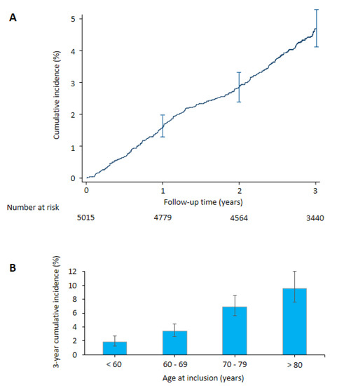 Incidence of a first episode of atrial fibrillation (AF). (A) Cumulative incidence of AF during the follow-up period (death as the competing event). (B) 3-year cumulative incidence of AF (death as the competing event) according to age at inclusion. Error bars are 95% CI.