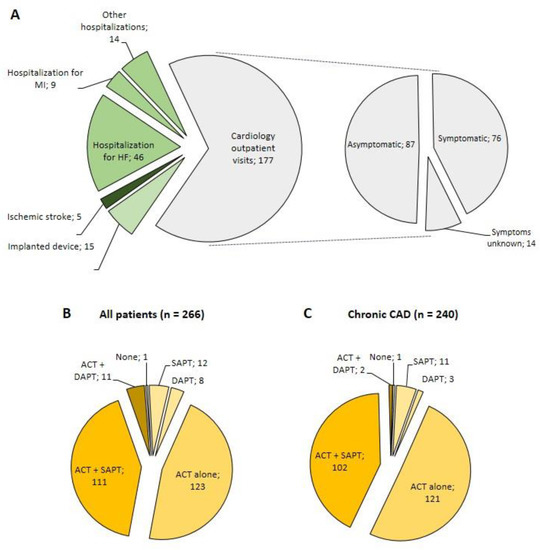 Diagnostic circumstances and antithrombotic management of incident atrial fibrillation (AF) in coronary artery disease (CAD) outpatients. (A) Diagnostic circumstances of incident atrial fibrillation (AF) in coronary artery disease (CAD) outpatients. HF, heart failure; MI, myocardial infarction (B) Antithrombotic strategy in all coronary artery disease (CAD) outpatients with incident atrial fibrillation (AF); ACT, anticoagulant therapy; DAPT, dual-antiplatelet therapy; SAPT, single-antiplatelet therapy. (C) Antithrombotic strategy in patients with incident AF in a context of chronic CAD (i.e., patients without recent (<1 year) history of myocardial infarction and/or percutaneous coronary intervention).