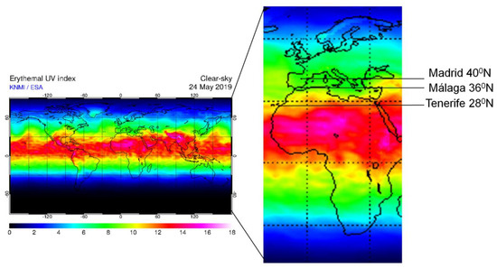 Map of world ultraviolet radiation erythemal index, with the three provinces reported in this study. This index is a measure of ultraviolet radiation (UVR) at ground level on the Earth, being an estimation of the UV levels that have important effects on human skin. Modified from: http://www.temis.nl/uvradiation/UVI/uvief0_wd.gif (accessed 24th of May 2019).