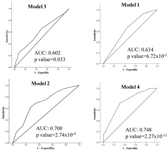 Receiver operating characteristics (ROC) generated from the LR analysis were performed and quantified using the area under the curve (AUC) to evaluate the predictive value of the different models. ROC curve analysis was performed with the data of probability predicted by the LR models for each individual of the sample in each of the models.