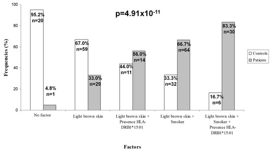 When we examined the combination of the different factors, we observed that only 4.8% of the subjects without any risk factors were MS patients. Of the individuals who had LBS as the only risk factor, 33% were patients. The percentage of MS patients increased in the group of subjects with LBS plus the presence of HLA-DRB1*15:01 (56.0%), was higher when the two factors were LBS plus smoking (66.7%) and became maximum when we considered the presence of the 3 factors, LBS, smoker and presence of HLA-DRB1*15:01 (83.3%) (p < 0.00001) (Figure 3).