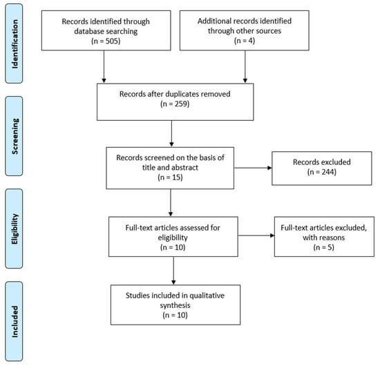 The information flow of the search and selection of studies is shown in Figure 1. Following the electronic database searches, 505 articles were identified and screened for retrieval and four additional records were identified through other sources. Among the initially identified articles, 259 studies were retrieved after the removal of duplicates. Thus, in the first selection phase, a total of 244 articles were excluded on the basis of title and abstract. In the second phase, on the examination of their full texts, five articles were eliminated and the reasons for exclusion were: overview article (n = 2), not related to OSA (n = 1), patients who did not receive both treatments, i.e., surgical and orthodontic treatment (n = 1) and retracted article (n = 1). Therefore, ten studies met all the inclusion criteria and remained for quantitative synthesis.