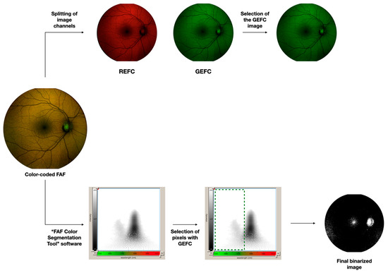 The area occupied by green-emitting fluorophores was investigated by importing the color-coded FAF image in the software called “FAF Color Segmentation Tool” and developed by CenterVue. This software grants to visualize fluorescence intensity and emission wavelengths as a two-dimensional graph. We selected those pixels characterized by a GEFC signal and finally obtained a binarized image with these pixels visualized in white.