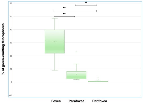 Median (interquartile range, IQR) area occupied by green-emitting fluorophores was 3.6% (1.9–4.7%) in the macular region. In the topographical analysis, this percentage was higher in the foveal region (median = 33.3%, IQR = 21.9–41.2%), as compared with both the parafoveal (median = 5.3%; IQR = 2.4–8.1%; p < 0.0001) and perifoveal (median = 0.5%, IQR = 0.2–0.8%; p < 0.0001) regions (Figure 2). A significant statistical difference was also found in the comparison between the parafoveal and perifoveal regions (p < 0.0001) (Figure 2).