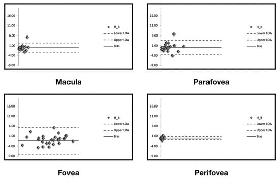 The CR (the value below which the difference between two measurements will lie in 95% of cases) was 2.3% for the entire macular region. In the topographical analysis, the CR was lowest in the perifoveal region (Table 1).