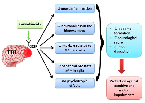 The use of cannabinoids in TBI increases neurobehavioral function, working memory performance and decreases the neurological deficit and ameliorates motor deficit through down-regulation of pro-inflammatory markers, oedema formation and BBB permeability, preventing neuronal cell loss and up-regulating the levels of adherence junction proteins.