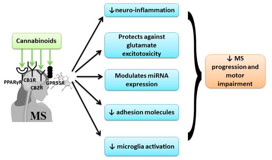 Interestingly, some studies showed the up-expression of CB1R and CB2R in the glial cells of patients suffering from MS, showing the implication of CBR in the pathogenesis of MS disease [111]. Modulation of CB2R in MS is mainly associated with anti-inflammatory effects.