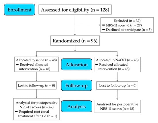 This report was written because there were unexpected early findings that the authors deemed important to share. The sample size analysis for this study was based on the primary outcome measure, which was pulp survival (clinical and radiographic) one year after intervention. Previous prospective clinical comparative trials of greater than one-year in duration have demonstrated that caries exposure, rinsing with NaOCl, and subsequent pulp capping have reported a 90% success rate [18,20,21]. Other carious pulp capping studies using saline [8] or hydrogen peroxide [22] as a pupal rinse have reported lower success of 31% and 55%, respectively. These figures may be attributable to other variables such as the capping material. For the sample size calculation, we assumed that 65% was the appropriate success rate for carious pulp capping at one year rinsed with saline, while 90% represents the success of the NaOCl group. This represents a clinically important difference of 25% on which to base the power calculation. Therefore, a sample size of n = 48 per group (96 in total) would achieve 80% power with a type I error of 0.05, type II error of 0.2, and accounting for a 25% drop out. Secondary outcomes for the trial, including postoperative pain and early painful failure, were not subjected to a separate power calculation.
