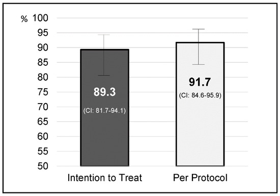 Helicobacter pylori eradication by intention to treat and per protocol.