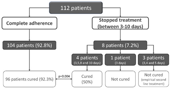 The treatment was well tolerated: no severe side effects (requiring either treatment or hospitalization) were reported, and 47 patients (41.9%) presented minor to moderate side effects, the most frequent were metallic taste (n = 21), mild diarrhea (n = 15), abdominal pain (n = 13) and nausea or vomiting (n = 13). All side effects disappeared shortly after the end of treatment. One hundred and four patients (92.8%) of the patients reported complete adherence to treatment. In the remaining eight patients (7.2%) the treatment was stopped between three and ten days, all because of digestive intolerance. Four of them were cured after 3, 5, 8 and 10 days; one was not cured after three days and three patients (who took the treatment for 3, 4 and 5 days) empirically received second line therapy without testing. These three patients were considered “not cured” in the analysis (Figure 2).
