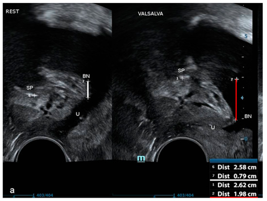 All women underwent pelvic floor ultrasound examination. Urethral length and BN position were measured in a standardized manner, with the patient on the gynecological chair in a semi-sitting position with the bladder filled to 200–400 mL. Three diameters of the bladder were measured in order to estimate the bladder volume before the examination. The probe (a 3.6–8.3 MHz vaginal transducer with a beam angle of 160°) was placed in the vaginal introitus at the level of the external urethral orifice. With the probe in this position, the urinary bladder, urethra, and pubic symphysis with the interpubic disc were visualized in the median sagittal plane, according to Interdisciplinary S2k Guideline: Sonography in Urogynecology [21]. The length of the hypoechogenic core of the urethra was measured from the BN to the pelvic diaphragm. This method of measurement has been proven to be highly repeatable and reproducible [22]. BN position at rest was measured as the shortest distance between the urethral-bladder junction and the horizontal line running through the lower edge of symphysis pubis and was shown in millimeters. Accordingly, BN position was measured in the maximal descent during the Valsalva maneuver (VM) (Figure 1).