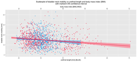Since we previously showed that urethral length is associated with BMI [1], an analysis of correlations between BMI and urethral length and BN mobility was performed. A highly statistically significant negative correlation was observed. Lower BN mobility is associated with increased BMI and urethral length (Figure 2).